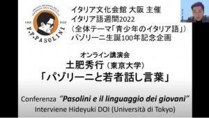 XXII Settimana della Lingua Italiana nel Mondo Sotto l’alto Patronato del Presidente della Repubblica Italiana L’Istituto Italiano di Cultura Osaka presenta una video conferenza dal prof. Hideyuki DOI (docente presso la Tokyo Univ.). ” Pasolini e il linguaggio dei giovani ” Per argomentare l’attenzione antropologica, ma anche linguistico del Pasolini scrittore-regista, centrata sui giovani di fine […]